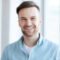 Bearded, brutal mechanic fixing hubcap of auto wheel, using equipment. Muscular man in white t shirt with tattoo on hand wearing in black gloves, working in autoservice.